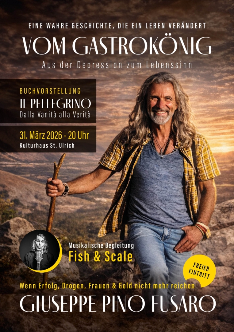 Am 31.03.2026 um 20.00 Uhr wird das Buch von *Giuseppe Pino Fusaro* im Kulturhaus von St. Ulrich vorgestellt und musikalisch von *Fish&Scale* begleitet. Der Abend verspricht bewegende und ehrliche Einblicke voller starker Emotionen.