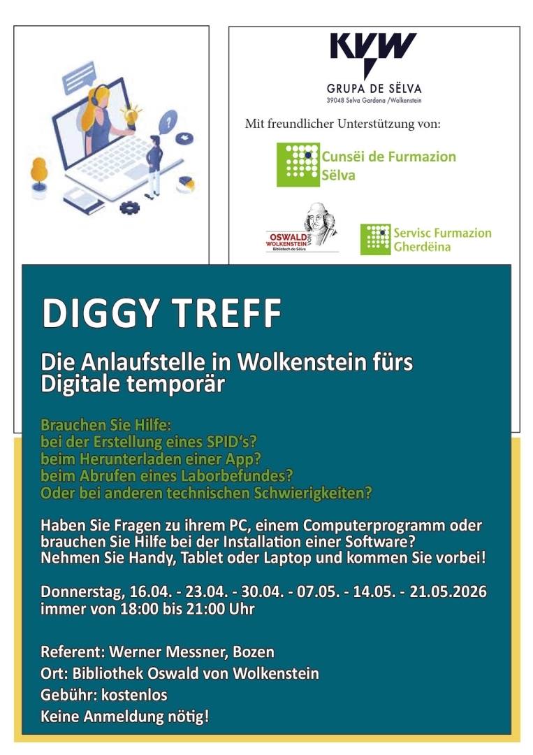 "DIGGY" ist Ihre Anlaufstelle für Digitales. In den DIGGY -Treffs bauen die Besucher ihre digitalen Kompetenzen aus, erhalten Antworten auf ihre Fragen oder surfen ganz einfach im Internet. Die Besucher entscheiden selbst, wann, wie lange und wofür sie den DIGGY-Treff nutzen.