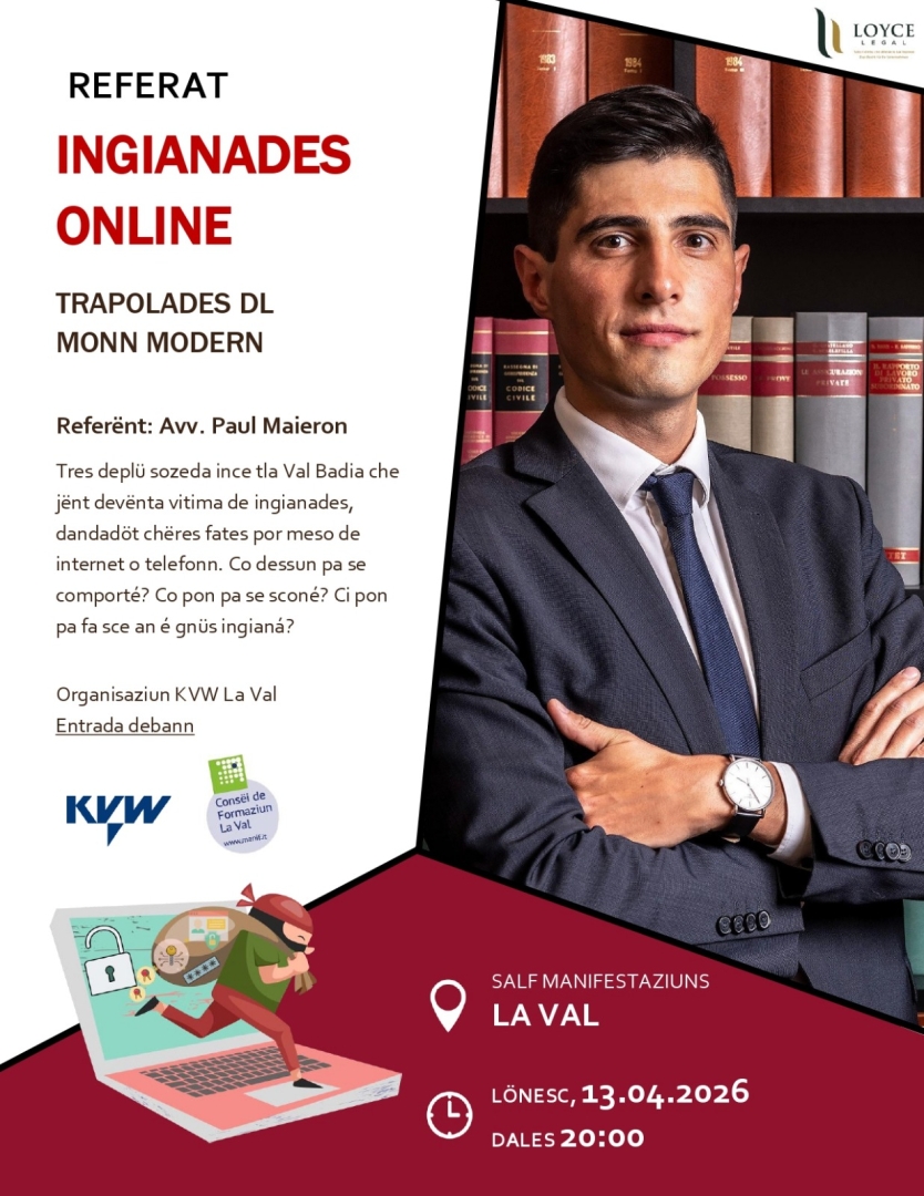 Tres deplü sozeda ince tla Val Badia che jënt devënta vitima de ingianades, dantadöt chëres fates por meso de internet o telefon. Co dessun pa se comporté? Co pon pa se sconé? Ci pon pa fá sce an é gnüs ingianá?
